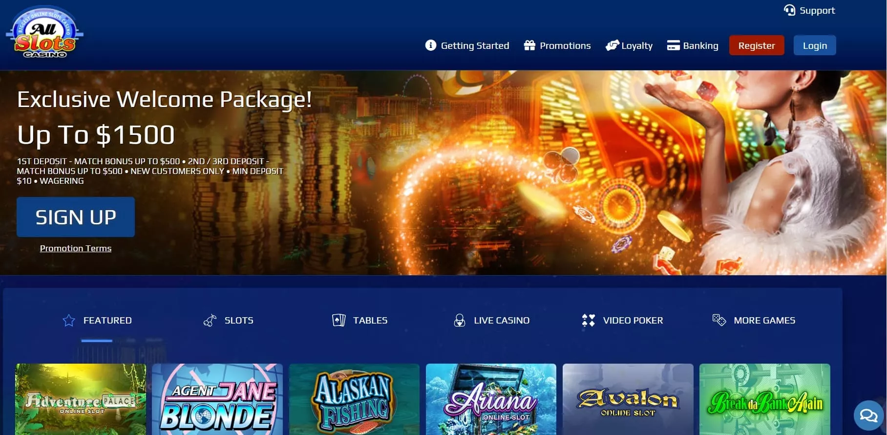 While the casino may not look the most enticing or modern, AllSlots Casino still has something that is rock-solid and keeps attracting both new and old customers. For instance, when you land on its homepage, you will see a generous welcome All Slots Casino bonus and a sneak peek of all the games that you will find here.