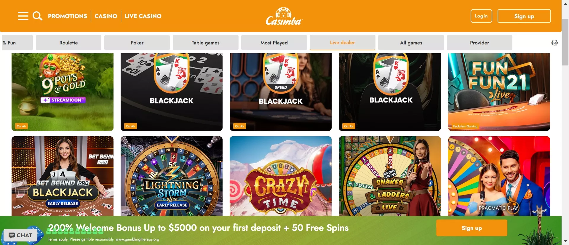 Live games are the best way to experience a real casino experience; Casimba’s Live Dealer category refers to the main games provided by essential providers such as Evolution Gaming. After a quick account creation, the user can already watch games such as: