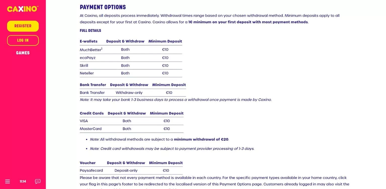 However, these can only be used for withdrawals, just like the Paysafe pre-paid voucher is available for deposits. The other options are universal! Casino Caxino processes payouts as quickly as possible, but credit card payments can take up to three business days. This is out of the operator’s control!