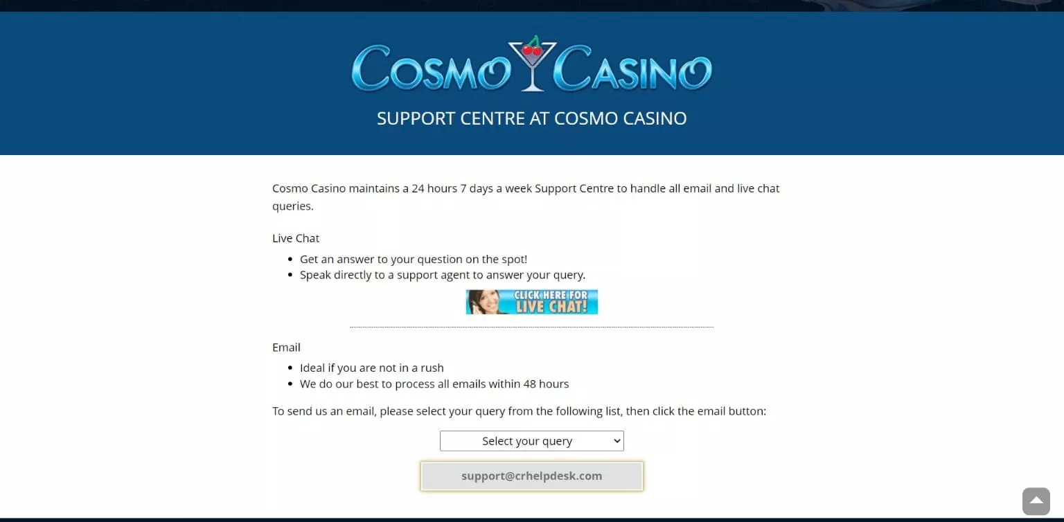 Are you looking to know the status of your withdrawal request? Need additional information on Cosmo Casino free slots or bonus offer? Or perhaps you need to have details about Cosmo Casino free coins or spins clarified? Regardless of your situation, you will receive timely help from Cosmo’s customer care team. You can reach them promptly via live chat.