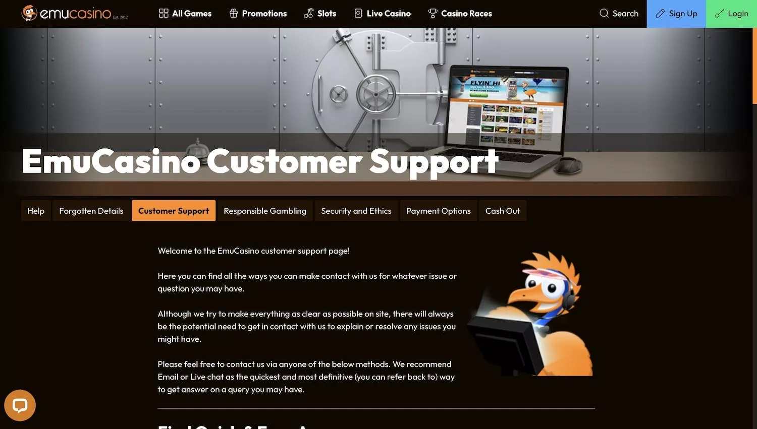 Emu Casino has a FAQ section on the site, which can substitute a chat with the customer support service. Check out the page to get useful information about gambling on this gambling website.