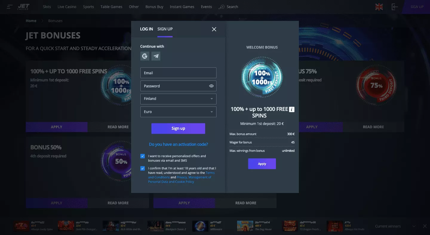 The activity of any player on the site of Jet casino begins with the creation of an account. To activate Casino Jet registration by clicking on the appropriate button in the menu, which will require the user to perform a couple of simple steps.