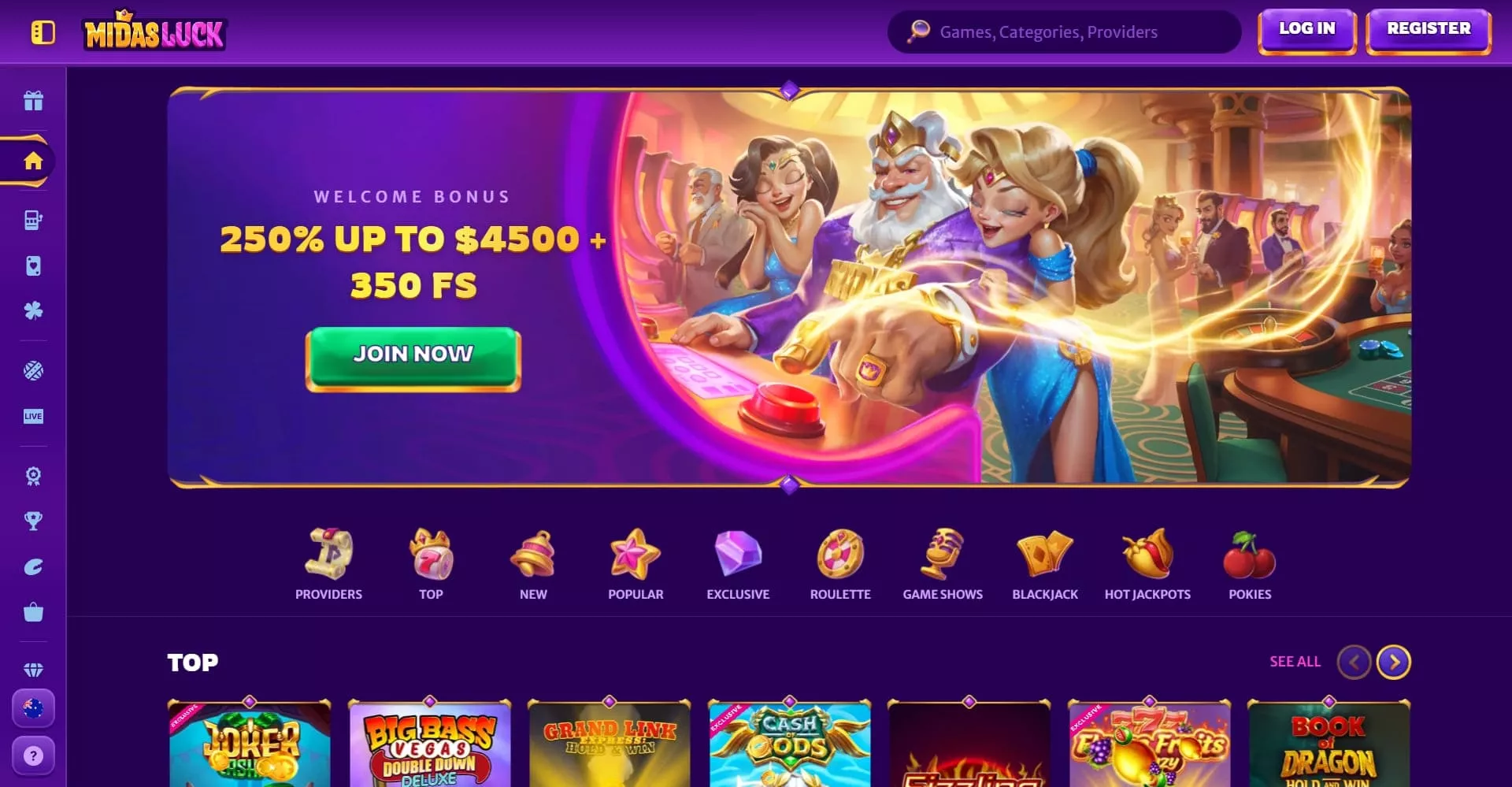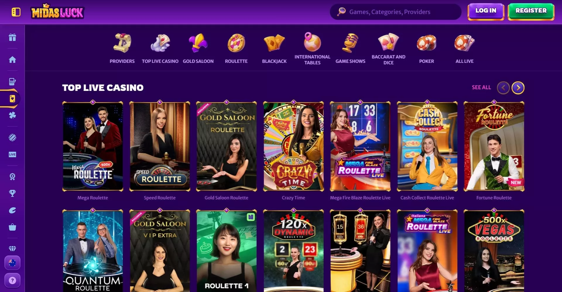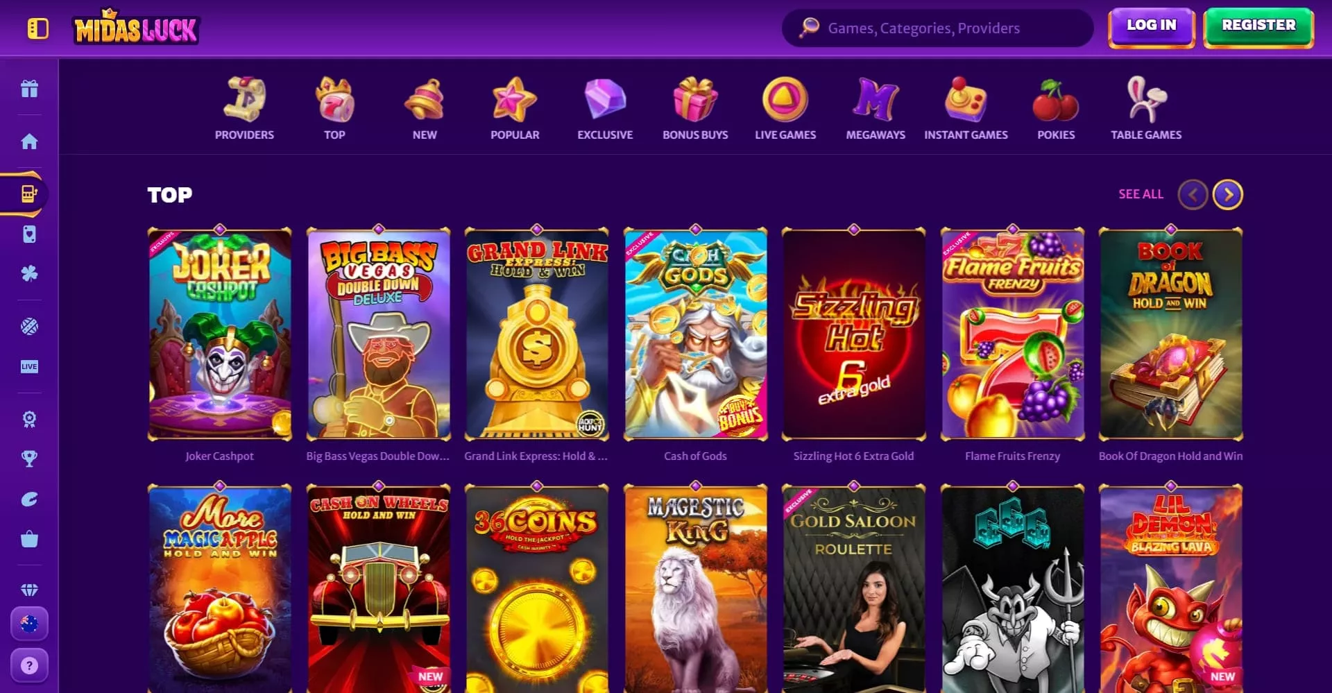 Our team was impressed with the number of MidasLuck casino online game titles. There are 5,000+ games: Top, New, Popular, Exclusive, Bonus Buys, Live Games, Megaways, Instant Games, Pokies and Table Games.