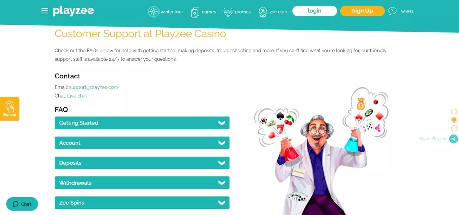 It is simple to contact customer service. Simply press the chat icon to connect to a specialist right away. Players can talk about anything with the specialist, from late payments to even getting their gambling habits under control. You may also opt to send an email to support@playzee.com, which is available 24 hours a day, seven days a week, much like the live chat feature.