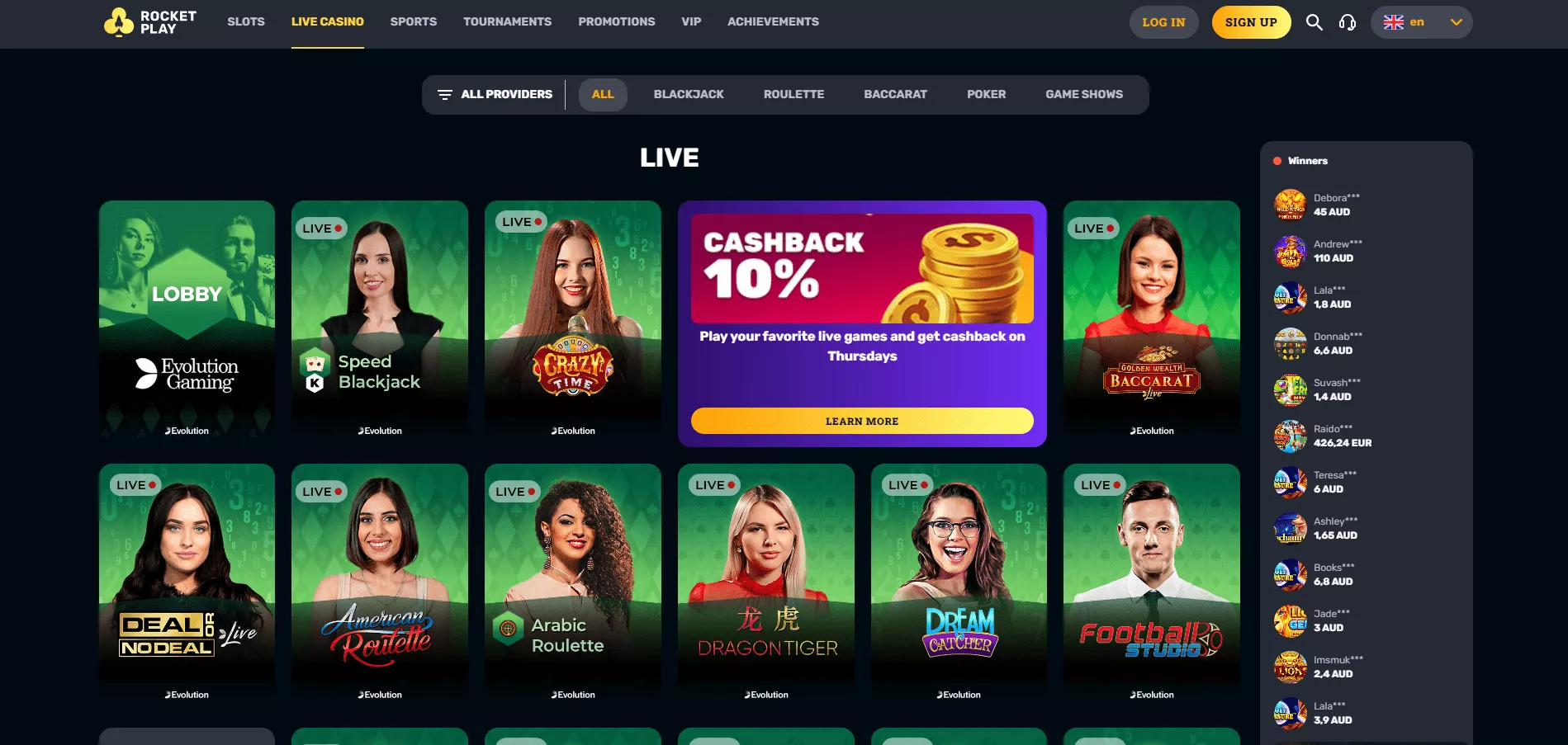Would you wish to play a live dealer game on RocketPlay casino, then be ready to pick from hundreds of HD streams. Whether you prefer a 1-on1 round of live blackjack or roulette on the VIP table, it has them all. It is a beautiful collection comprising various live blackjack, roulette, baccarat, pokies, and game shows.