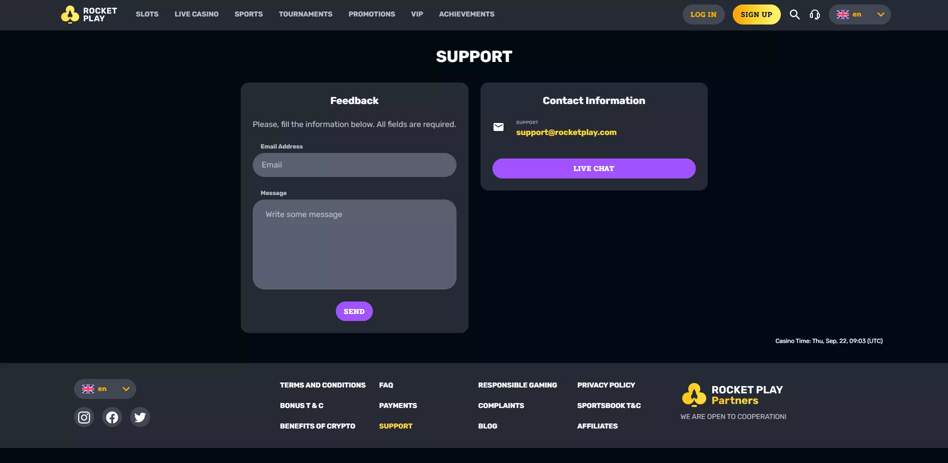 RocketPlay always has its customer support agents on standby 24/7 on live chat and email. The team is fluent in several languages, including English, French, German, Portuguese, and Japanese. Live chat is perfect for quick, pressing issues, while email support is suitable for lengthy matters that need more clarity. Apart from the two, it has a comprehensive FAQ section explaining most problems thoroughly.