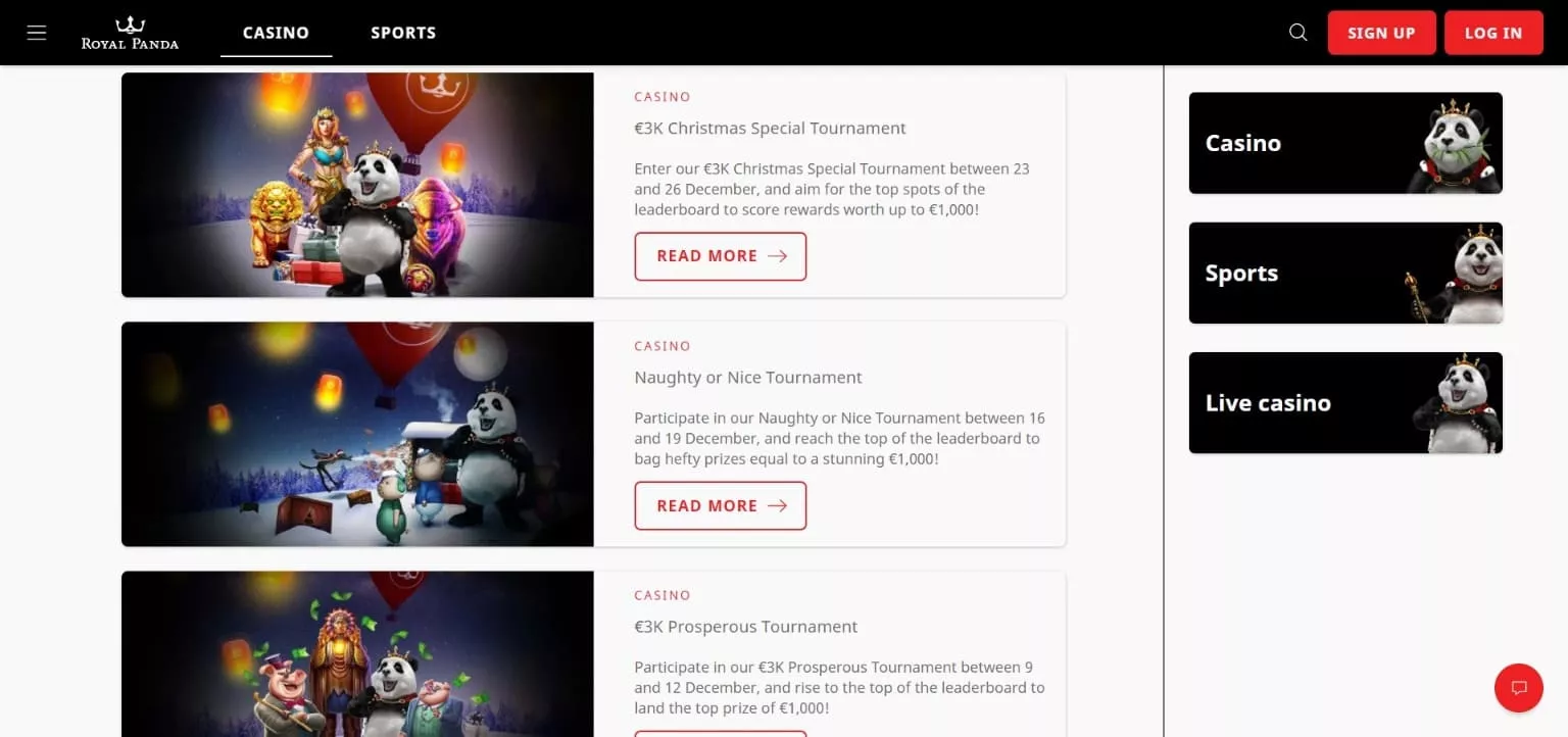 - Competitions, gifts and events. Loyal Royal Panda players can continuously enjoy various exciting extras, such as exciting tournaments, amazing gifts, and life wins.
