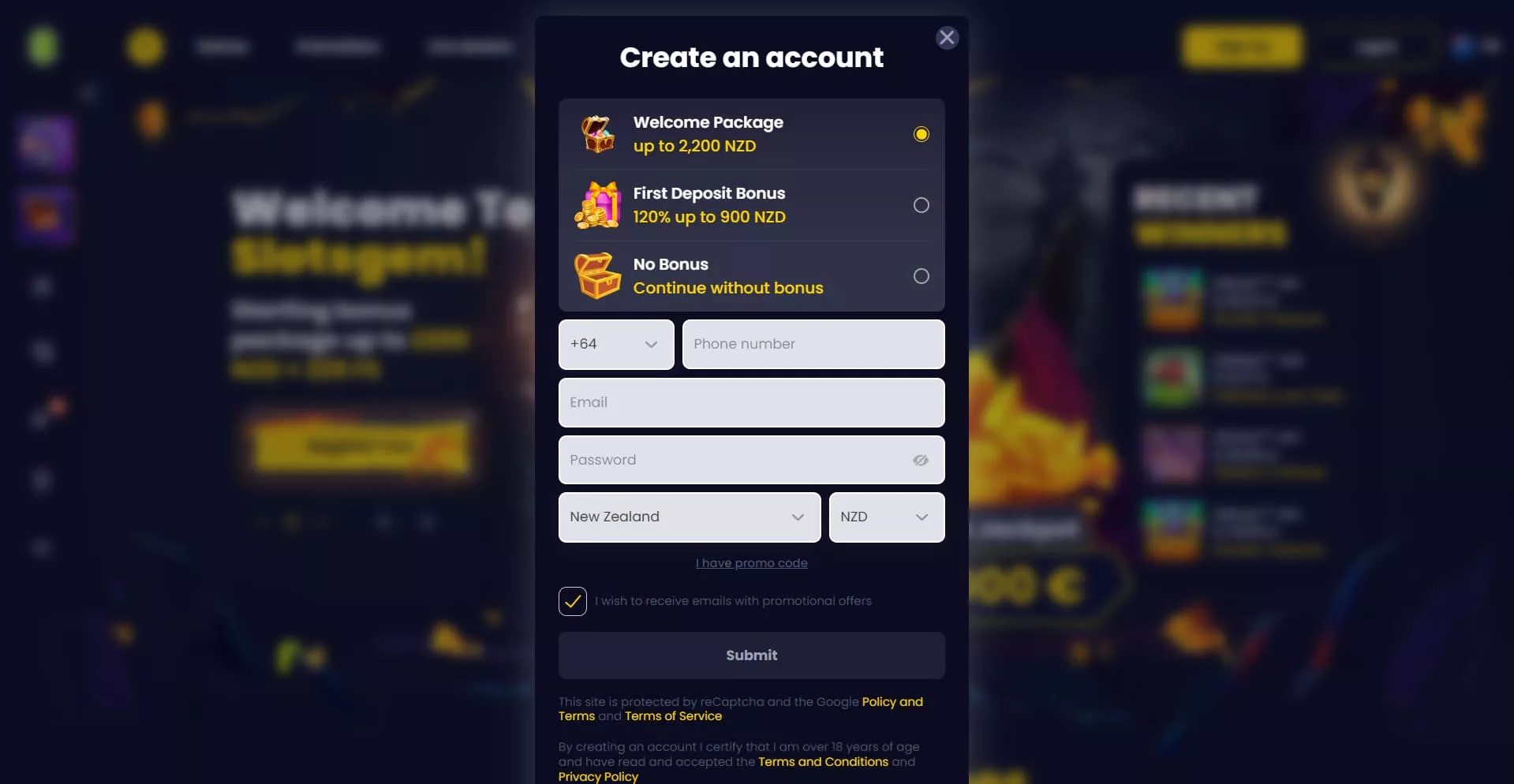 Proceed to SlotsGem casino’s official site and click Sign Up. To register in SlotsGem сasino online, provide your phone number, name, password, country and currency you would like to use. Before you can make your first deposit, you should fill out the form with your personal details.