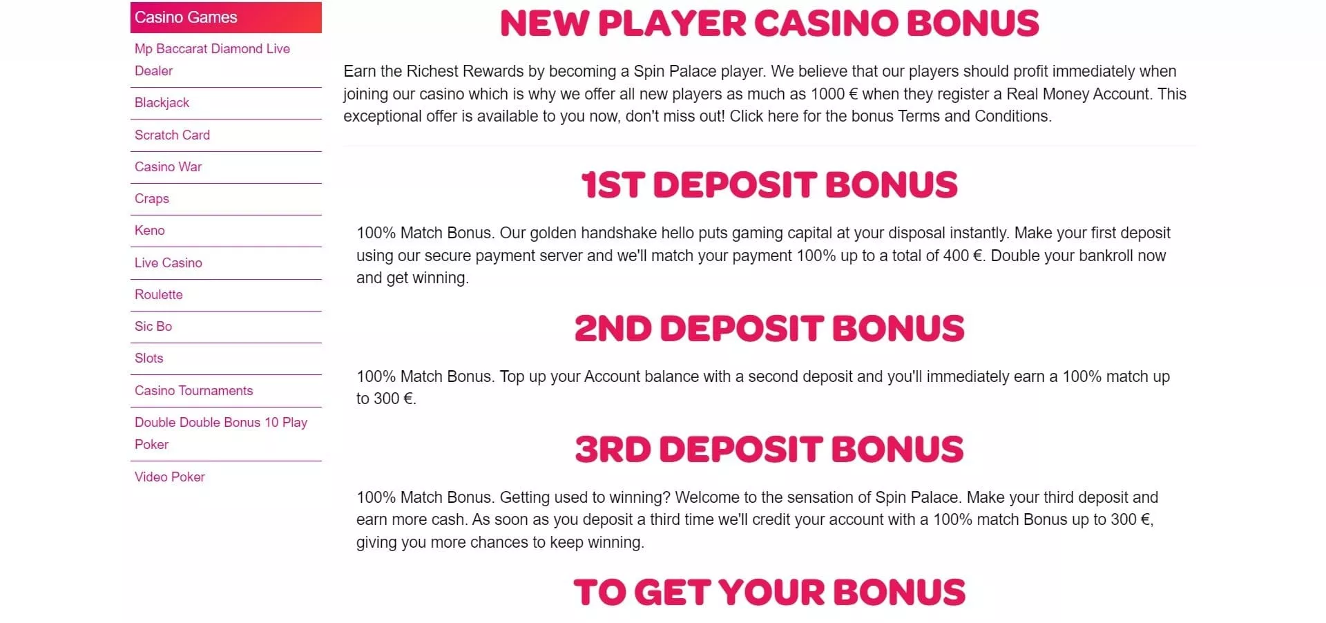 The betting site offers a wide range of games and products. These games are developed by Microgaming, one of the best software providers in the market today, and have an average payout of 90%. Looking at the Spin Palace homepage, it is clear that the provider is on a mission to become the International House of the best online casino games. The search for a growing range of games and the constant optimization of the platform is clearly at the forefront.