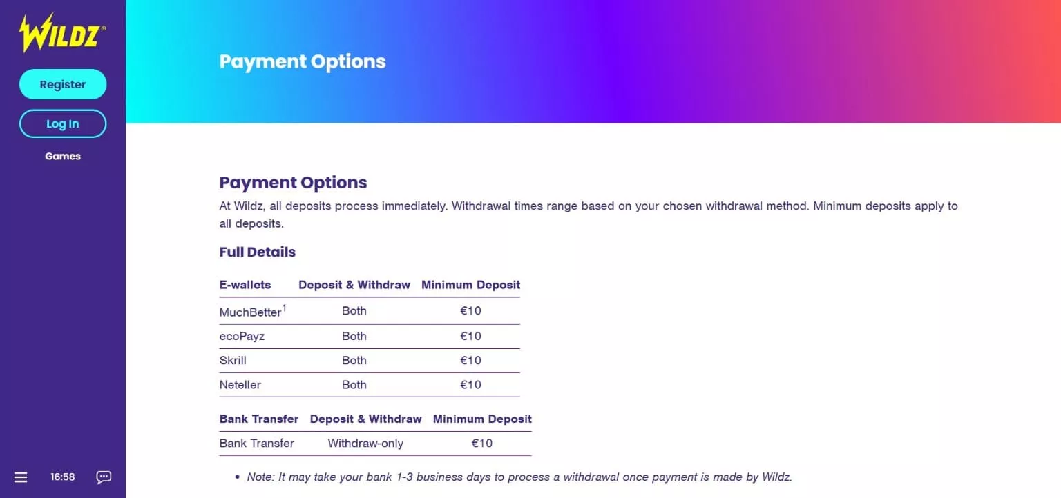When you place a withdrawal request, it will take between 24 and 48 hours for Wildz casino review and confirm the transaction. From this moment, the money leaves the operator’s platform and is redirected to your WildzCasino withdrawal method. Will this procedure be immediate? It depends on the method used.